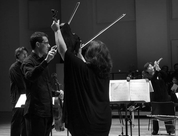 In der Rückschau auf das Konzert im Festspielhaus Hellerau lassen sich ein paar Aspekte festhalten, die interessant wären, einmal mit Silke Fraikin, mit den Zuhörern und Musikern zu debattieren. Zuerst wäre da vielleicht die Frage, ob die jungen Komponisten die Spielräume an möglichen Besetzungen, der Instrumentenbehandlung und nicht zuletzt der Vorstellung, was eine Komposition heute ausmacht und was sie begrenzt, ausführlich genug reflektiert haben. Ich meine: nein. Wohl kratzten einige Werke vorsichtig an etablierten instrumententechnischen Grenzen; bearbeiteten die Bratscher ihre Instrumente gegenseitig, und hörten wir ein kleines Tamtam unter Wasser. Allein blieben doch viele Gewohnheits-Zäunchen, die anderswo längst eingerissen sind, hier stehen; für hochgezogene Augenbrauen sorgte schon die Bewegung einzelner Interpreten im Raum. Was, wenn sie daneben Einrad gefahren wären oder bunten Sand aus ihren Taschen rieseln lassen hätten, wenn sie in ihre Instrumente gesungen, das Publikum zur Interaktion aufgefordert hätten oder mit dem Raum, seiner Akustik und seiner Kubatur stärker interagiert hätten?
